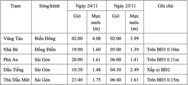 Theo đó, mực nước cao nhất ngày tại hầu hết các trạm trên sông Sài Gòn sẽ xuống chậm trong 5 ngày tới. Đỉnh triều cao nhất ngày ở mức xấp xỉ hoặc trên báo động 2 sẽ duy trì đến hết ngày 26 và 27-11, riêng trạm Thủ Dầu Một ở mức cao trên báo động 3 trong 5 ngày tới.