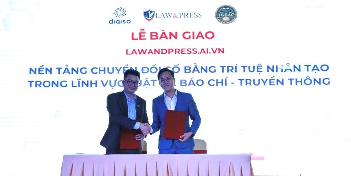 Ths Ngô Hữu Thống, Viện trưởng AiOV thay mặt Công ty TNHH Giải pháp số DIGISO ký bàn giao nền tảng Lawandpress.ai.vn cho đại diện TGAC