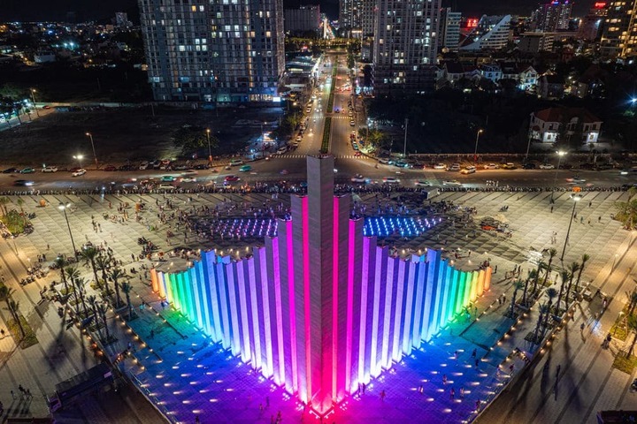 Quảng trường và Tháp Tam Thắng lung linh sắc màu về đêm. (Ảnh: Hải Triều)